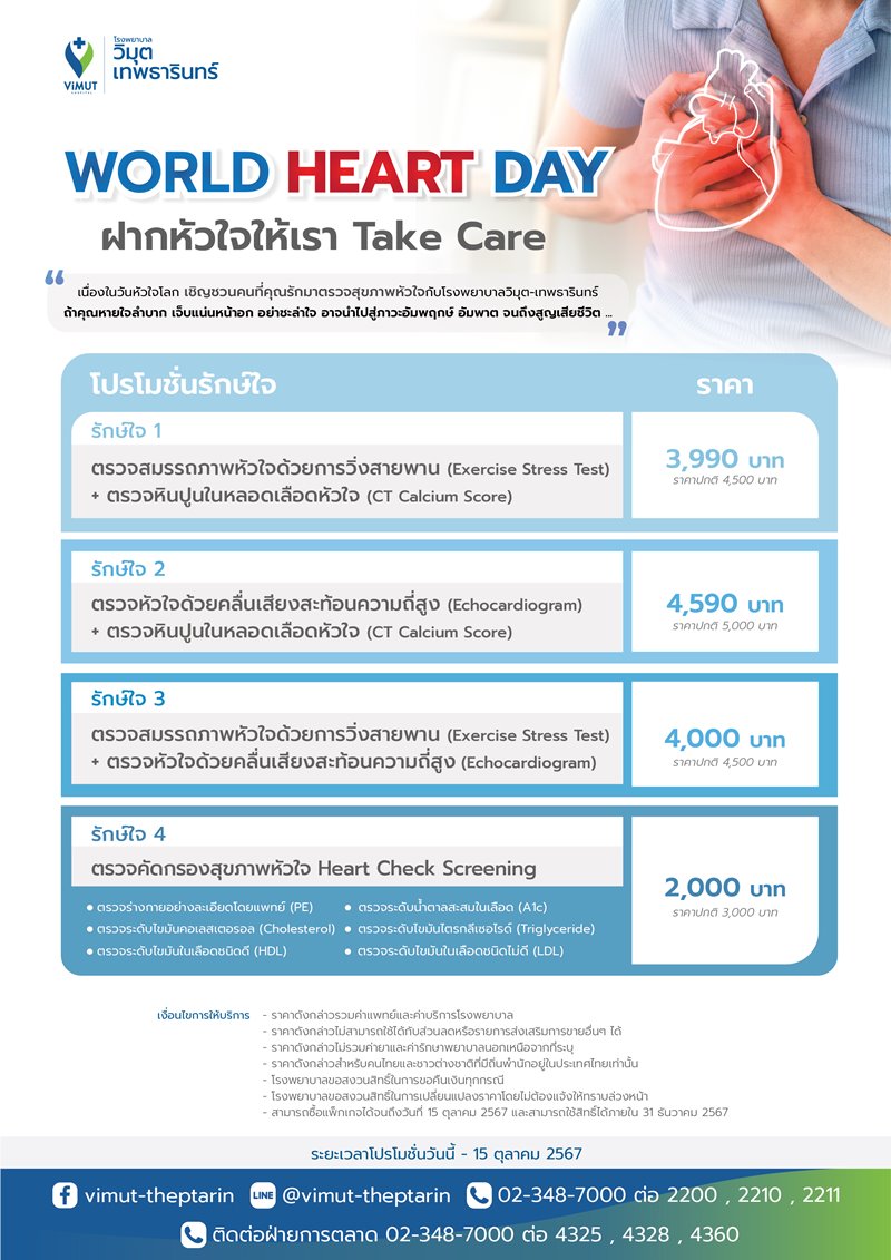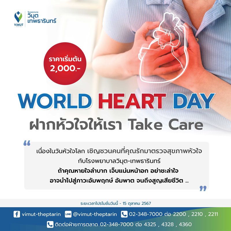 ในโอกาสวันหัวใจโลก (World Heart Day 2024) โรงพยาบาลวิมุต-เทพธารินทร์ ขอเชิญทุกท่านมาตรวจสุขภาพหัวใจกับแคมเปญ “ฝากหัวใจให้เรา Take Care” ที่มาพร้อมกับโปรแกรมตรวจราคาโปรโมชั่น ได้แก่