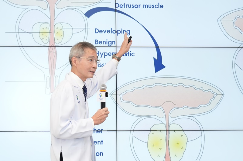 Dr. Danaiphand Akarasakul, a Urologist, says, “Benign prostatic hyperplasia (BPH) is a health issue associated with aging, and it is a condition we cannot prevent. However, advancements in medical science have provided us with safe treatment options and quick recovery methods. It is essential for men aged 50 and above to have annual prostate check-ups. In addition to BPH, prostate cancer poses a serious threat that should not be overlooked, as it ranks as the fourth most common cancer in men. In its early stages, prostate cancer may not present obvious symptoms and is often detected through routine health screenings or elevated serum PSA (prostate-specific antigen) levels. When cancer cells grow and compress the urethra, it can lead to urinary issues such as difficulty urinating, weak urine flow, urinary incontinence, burning sensations during urination, or blood in the urine and semen. Although these symptoms are similar to those of BPH, it is important to note that BPH itself is not a risk factor for developing prostate cancer. Men with BPH have approximately a 20% chance of developing prostate cancer. If urine cannot be fully expelled, bacteria can accumulate, increasing the risk of infection, and in some cases, bladder stones may also form. Importantly, allowing bladder inflammation and kidney deterioration to progress can lead to permanent damage. Therefore, if men experience any abnormal urinary symptoms, they should not tolerate or ignore them. Consulting a doctor for an accurate diagnosis and treatment is vital to ensuring their safety and well-being.”