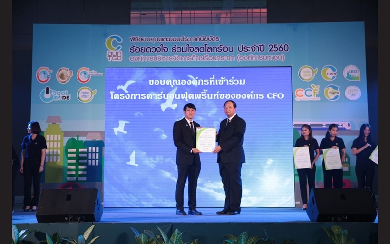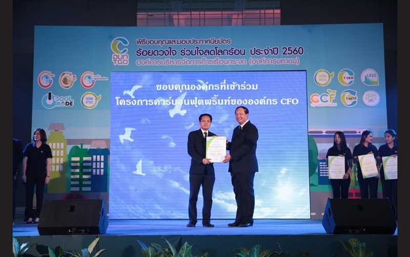 คุณภณวัฒน์ ศิรินันทวกุล VP-Precast Production ผู้แทนจากโรงงานพฤกษา พรีคาสท์ ลำลูกกา และคุณสุทธิชัย ช่างฟอก VP-Precast Production ผู้แทนจากโรงงานพฤกษา พรีคาสท์ นวนคร บริษัท พฤกษา เรียลเอสเตท จำกัด (มหาชน) ขึ้นรับมอบประกาศนียบัตรจากประธานกรรมการองค์การบริหารจัดการก๊าซเรือนกระจก (องค์การมหาชน) ในพิธีขอบคุณและมอบประกาศนียบัตร “ร้อยดวงใจ ร่วมใจลดโลกร้อน ประจำปี 2560” ในฐานะที่บริษัทฯ ให้ความใส่ใจและตระหนักถึงความสำคัญของการลดปริมาณก๊าซเรือนกระจกที่ปล่อยออกมาจากกิจกรรมต่างๆ ขององค์กร เช่น การเผาไหม้ของเชื้อเพลิง การใช้ไฟฟ้า การจัดการของเสีย และการขนส่ง เป็นต้น และได้รับการรับรองขึ้นทะเบียนเป็นองค์กรที่มีการจัดทำคาร์บอนฟุตพริ้นท์ขององค์กร หรือ CFO