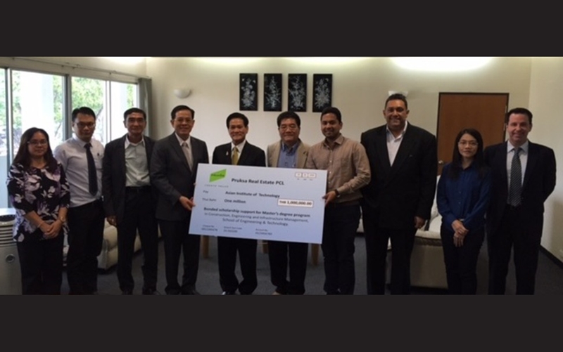 คุณอุดมศักดิ์ แย้มนุ่น : Executive Vice President (Human Capital) เป็นผู้แทนบริษัท พฤกษา เรียลเอสเตท จำกัด (มหาชน) มอบทุนการศึกษา จำนวน 1 ล้านบาท แก่ Mr.Soumyshree Bariki นักศึกษาหลักสูตรปริญญาโท สาขา Construction, Engineering and infrastructure Management (CEIM) สถาบันเทคโนโลยีแห่งชาติ (AIT)