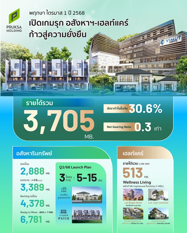 “พฤกษา โฮลดิ้ง” เผยผลการดำเนินงานไตรมาส 1 ปี 2568 รายได้รวม 3,705 ล้าน จากการเปิดเกมรุกอสังหาฯ ครบเซ็กเมนต์ ผนึกกำลังด้านธุรกิจเฮลท์แคร์เดินหน้าสู่ผู้นำด้านเวลเนส เรสซิเดนซ์ การอยู่อาศัยที่ผสานความเป็นอยู่ที่ดีควบคู่การบริการด้านสุขภาพแบบยั่งยืน ยกระดับการอยู่อาศัยที่ “อยู่ดี มีสุข” พร้อมเดินเกมรุกขานรับมาตรการรัฐในไตรมาส 2 ด้วยการจัดแคมเปญ “บิงโกล์ด” ลุ้นบิง ชิงทอง ให้ลูกค้าได้รับสิทธิประโยชน์ครบทุกช่องทาง ทั้งได้ลุ้นรางวัล ได้ฟรีค่าใช้จ่ายในวันโอน และได้ส่วนลดเพิ่มเติม เปิดโอกาสให้เป็นเจ้าของบ้านและคอนโดได้ง่ายขึ้น