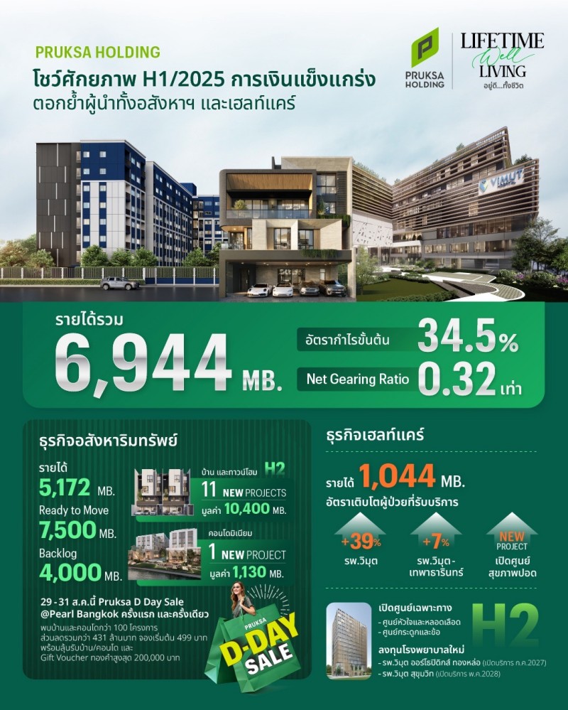 พฤกษา โฮลดิ้ง รายงานผลประกอบการครึ่งปีแรก ปี 2568 ทำรายได้ 6,944 ล้านบาท ยืนหยัดสร้างการเติบโตท่ามกลางภาวะตลาดท้าทาย ด้วยกลยุทธ์ขับเคลื่อน 2 ธุรกิจหลัก อสังหาริมทรัพย์และเฮลท์แคร์ ควบคู่การขยายธุรกิจที่เกี่ยวเนื่อง และยังคงรักษาสถานะทางการเงินมั่นคง ด้วยอัตราหนี้สินสุทธิต่อทุนเพียง 0.32 เท่า สะท้อนการบริหารจัดการทางการเงินที่ดีในอุตสาหกรรม พร้อมวงเงินสินเชื่อที่ยังไม่ใช้กว่า 9,100 ล้านบาท