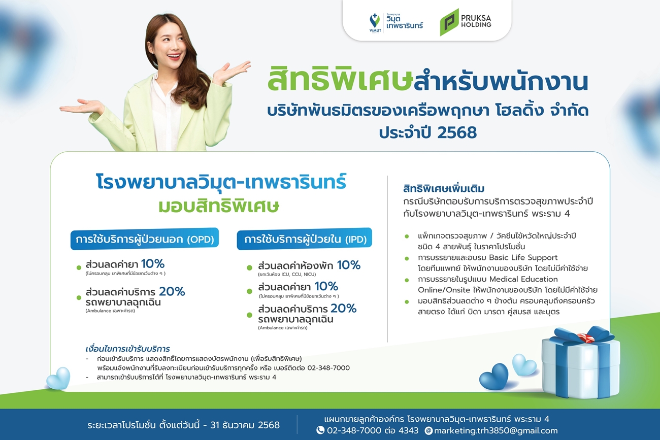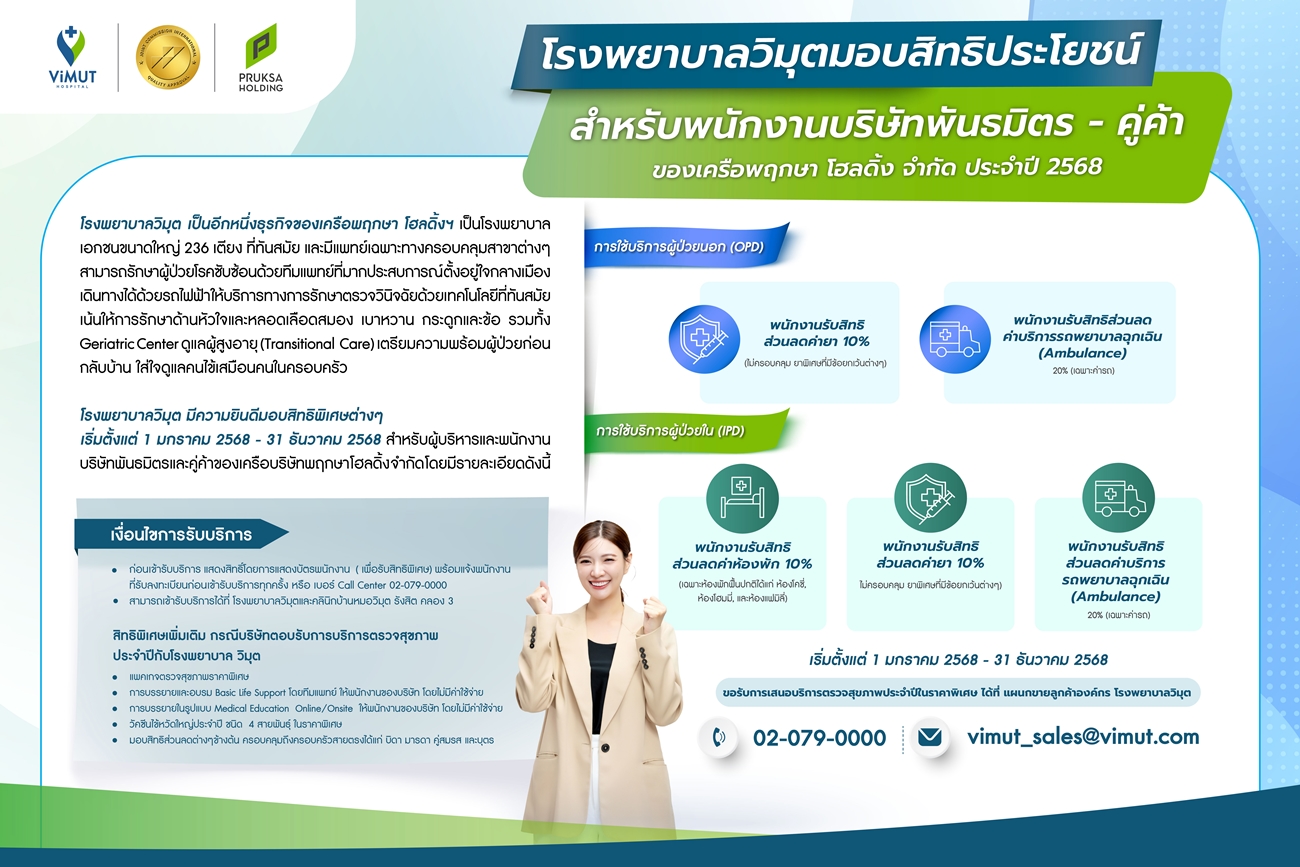 สิทธิพิเศษด้านการดูแลสุขภาพ โรงพยาบาลวิมุต และ โรงพยาบาลวิมุต – เทพธารินทร์ มอบสิทธิ์ส่วนลดค่ายา 10% (ไม่ครอบคลุมยาพิเศษที่มีข้อยกเว้นต่างๆ) และส่วนลดค่าบริการรถพยาบาลฉุกเฉิน 20% (เฉพาะค่ารถ) สำหรับบริการผู้ป่วยนอก (OPD) กรณีใช้บริการผู้ป่วยใน (IPD) รับสิทธิส่วนลดค่าห้องพัก 10 % (โรงพยาบาลวิมุต เฉพาะห้องพักฟื้นปกติได้แก่ ห้องโคซี่, ห้องโฮมมี่, และห้องแฟมิลี่ ด้านโรงพยาบาลวิมุต – เทพธารินทร์ ยกเว้นห้อง ICU, CCU, NICU) ส่วนลดค่ายา 10 % (ไม่ครอบคลุม ยาพิเศษที่มีข้อยกเว้นต่างๆ) และส่วนลดค่าบริการรถพยาบาลฉุกเฉิน 20% (เฉพาะค่ารถ) สอบถามรายละเอียดเพิ่มเติม โรงพยาบาลวิมุต โทร.02-079-0000 และ โรงพยาบาลวิมุต-เทพธารินทร์ โทร. 02-348-7000 ต่อ 4343